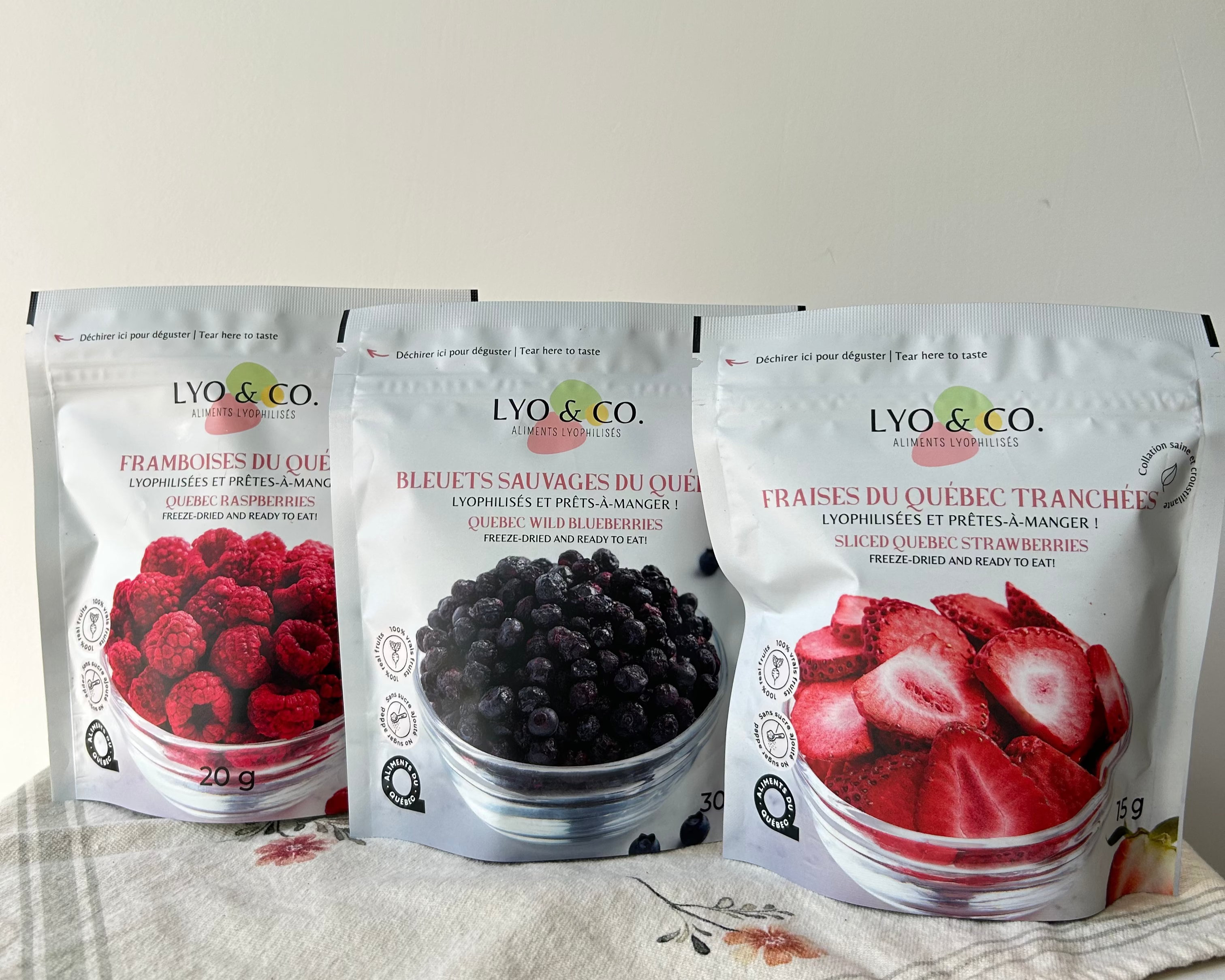Offert en 3 saveurs : Bleuets, fraises et framboises.